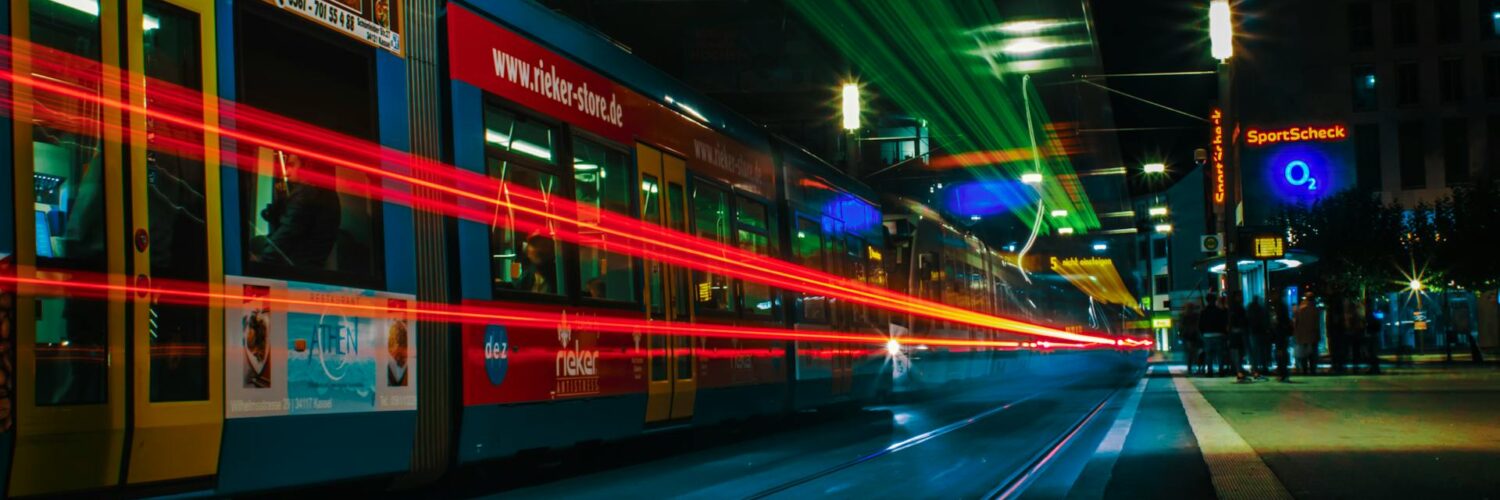 The time‑lapse photography of a tram at nighttime in Kassel, Hesse, Germany captures the city’s dynamic urban rhythm. Bright streaks of light trail across the frame as the tram moves, contrasting with the stillness of illuminated streets and station platforms. Neon signs, glowing lamps, and silhouetted figures add depth, creating a vivid portrait of Kassel’s public transit system against the evening sky.